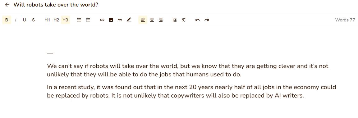 It’s healthy to say what’s on your mind, so I set its first task with the title: ‘Will robots take over the world?’ and add the keywords, ‘Mankind no longer useful’, ‘robots getting clever’, ‘will copywriters be replaced by AI’? Below is a snippet from what was produced.