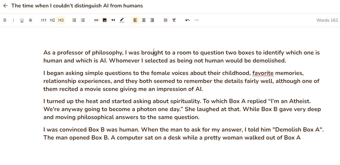 Staying on subject, let’s see what bestsellers can come from: ‘The time when I couldn’t distinguish AI from humans’ as the topic, and ‘worried’ as the tone.