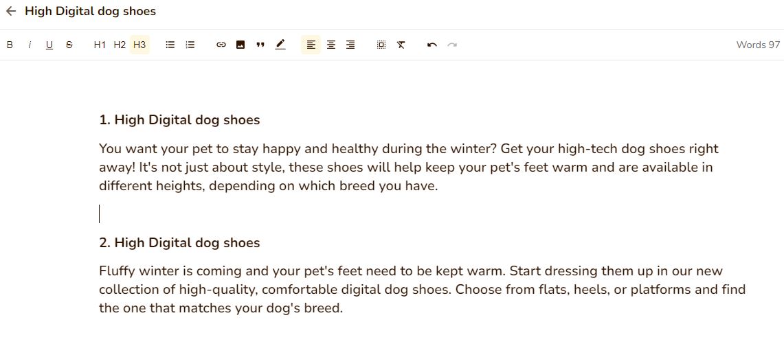 One of the most tedious tasks for any copywriter – I once wrote 789 different plastic pot descriptions – I’ll begrudgingly admit that having AI help with churning these out could indeed be useful. I give the computer a product name ‘High Digital dog shoes‘ and their benefits which are of course, ‘keeping your pet’s feet warm’ and being ‘available in a range of shapes and styles’.